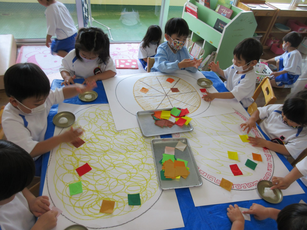 つぼみ組では、クレヨンあそびに続きのりを使った遊びを行いました。クレヨンあそびを通して、自分のイメージする好きな食べ物を楽しみながら描く姿があり、描いた食べ物の具材としてのりと折り紙を使い表現できるよう取り組みました始める前に、「1の指... -