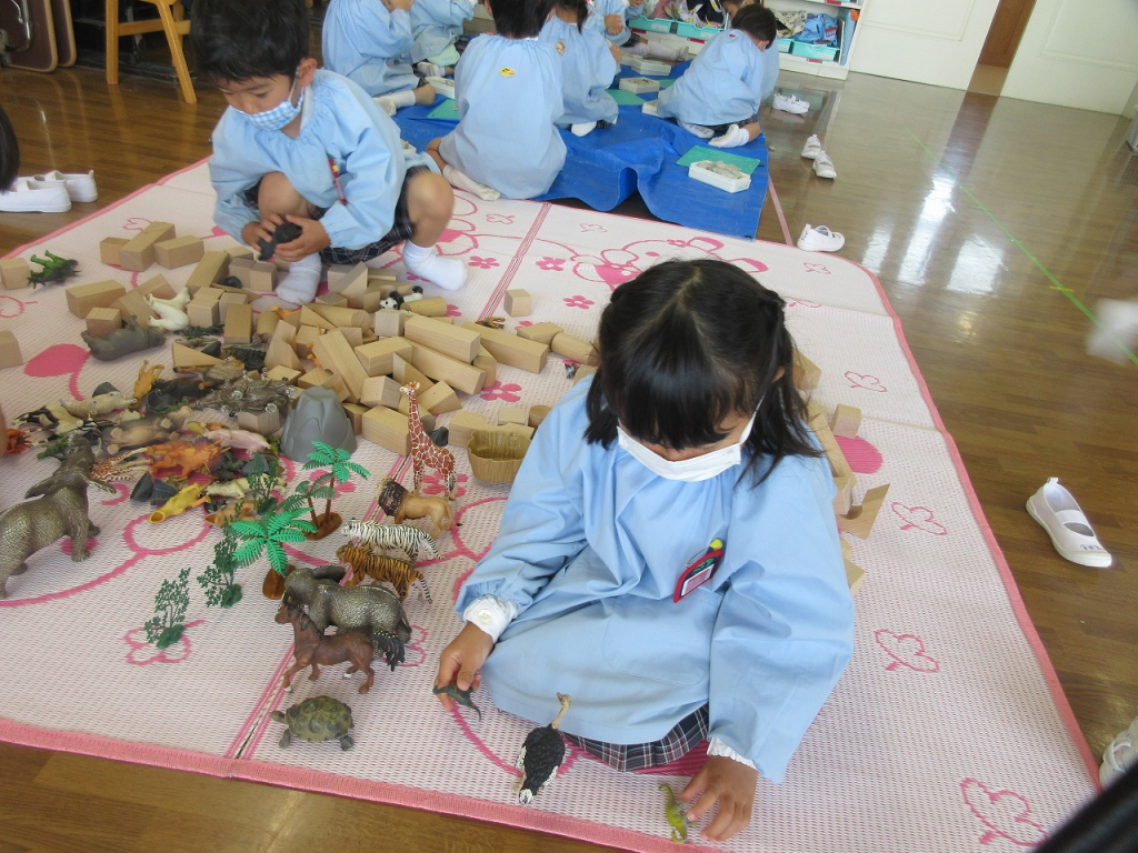 つぼみ組の子どもたちが夢中になって遊んでいる積み木あそび😆「先生見て見て~!!」と言いながら高く積み上げたり、家や車を作って遊んでいます🏠🚙最初のうちは積み木だけで遊んでいましたが、次第に動物🐰の人形と組み合わせて遊ぶ姿が見られるようになり... -