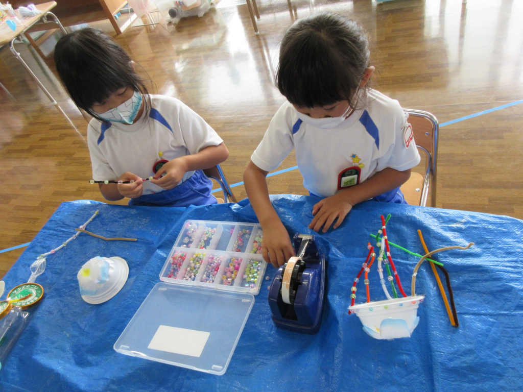 年長では、運動会で使う入退場門の飾り作りを行いました😄今年度の運動会は「スイミー」の物語がテーマになっているので、より海の世界を表現できるよう「海の生き物」を作り、門に飾ることになりました✨1学期からアトリエで様々な廃材や素材に触れたことで... -