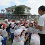 キーホルダーは、幼稚園の思い出の絵と、「ありがとう」「またあそぼうね」「いっしょにあそんでくれてありがとう」と、年少、年中組へのメッセージ。鬼ごっこをしているところ、三角屋根にのぼって遊んだこと、一緒に幼稚園バスに乗って通ったこと・・・今までの思い出を振り返り、プレゼントすることを意識し丁寧に描いていました