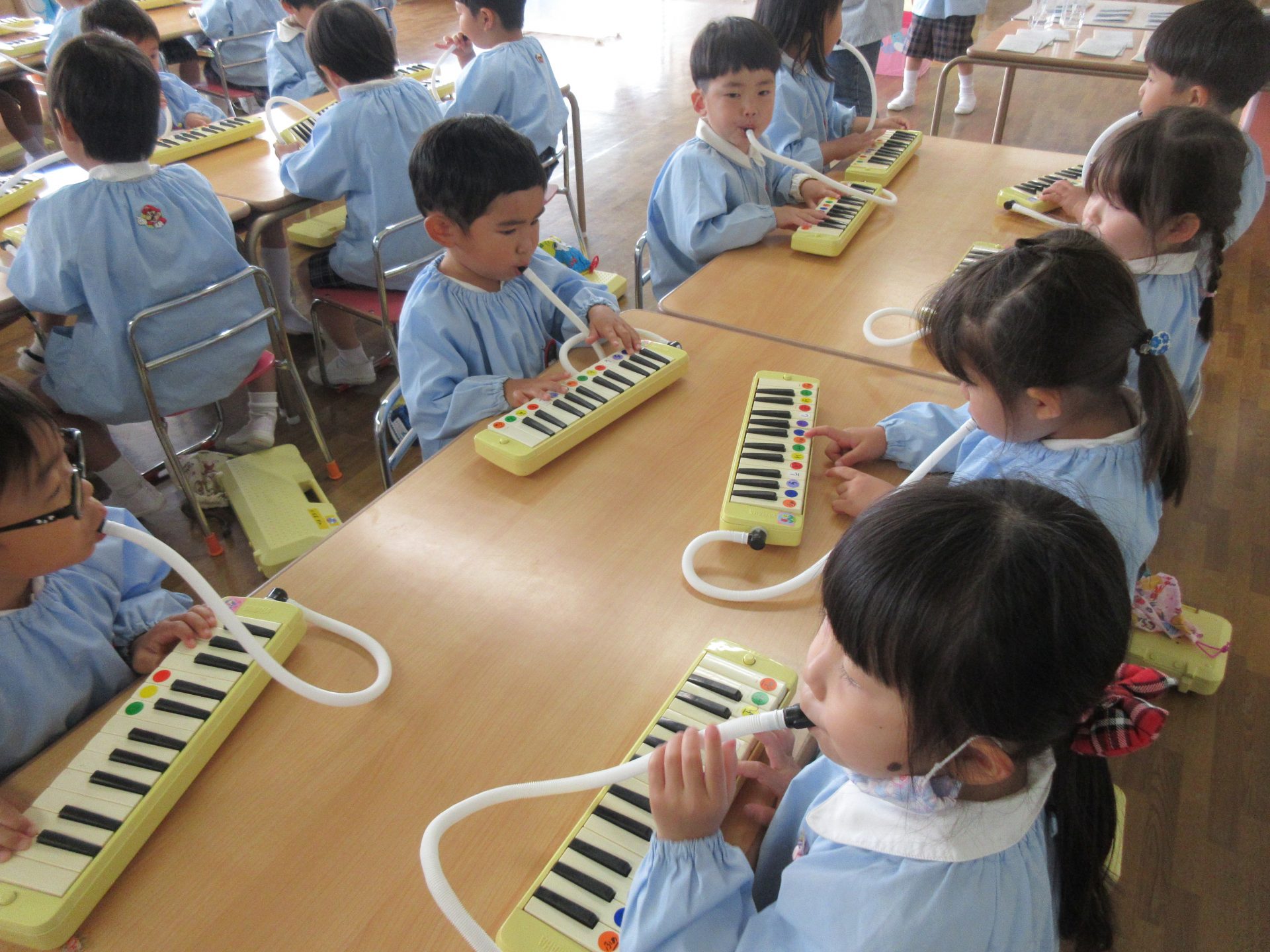 まず鍵盤ハーモニカの使い方、約束を話しました。そして、自分たちで準備をして「フー!」と吹き音がなると「先生!音が出たよ!!」と色々な音を出して音の違いを楽しんでいました😄