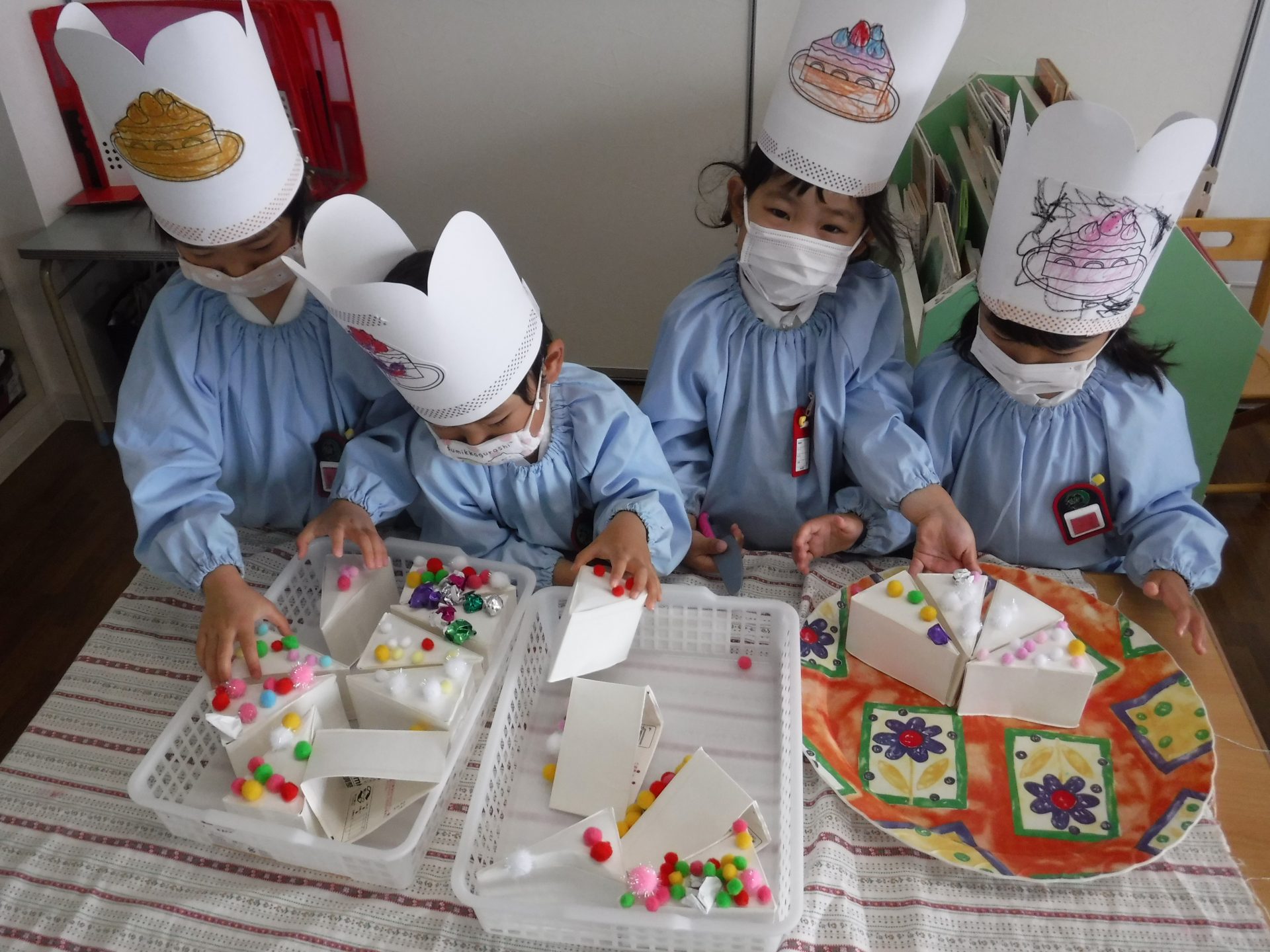 自分で色を塗ったケーキの絵がついている帽子がとても似合っていますね😍