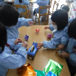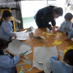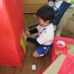 自分の鬼を作った経験から、「大きい鬼を作りたい!」という意見が出たり、「僕は桃太郎の乗っている船を作るんだ!」「私はお供の動物を作りたい!」など、色々なアイデアを全体で共有しながら、活動に取り組んでいます。
