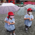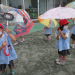 また、雨の時期ならではの活動として、雨が降った時に傘🌂をさしてお散歩に行けるように、お部屋で傘の使い方を確認してから、まずは園庭で傘を持って歩く練習をしました。