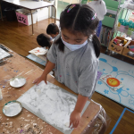 雲を表現するために、上部にだけスタンプする子、規則正しくスタンプをきれいに並べる子、ダイナミックに全面に塗る子と、それぞれの子が思い思いの雲☁を表現していました。