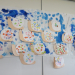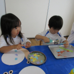 出来上がったかたつむりは、雨をイメージしてスタンプした大きな模造紙に飾ったことで、「かたつむりが散歩してる!」「僕のかたつむりの後ろにかたつむりが並んでるー!」と嬉しそうに友だちと話す姿もありました