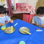 つぼみ組では、歌や手遊びだけでなく、はさみを使ったかたつむり作りとしても楽しめるよう取り組みました