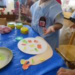 「かたつむりがサングラスしてるの!」「口をつけてみたよ!」と、切った画用紙を子どもなりにいろいろな形に見立てながら自分だけのかたつむり作りを楽しむことができました