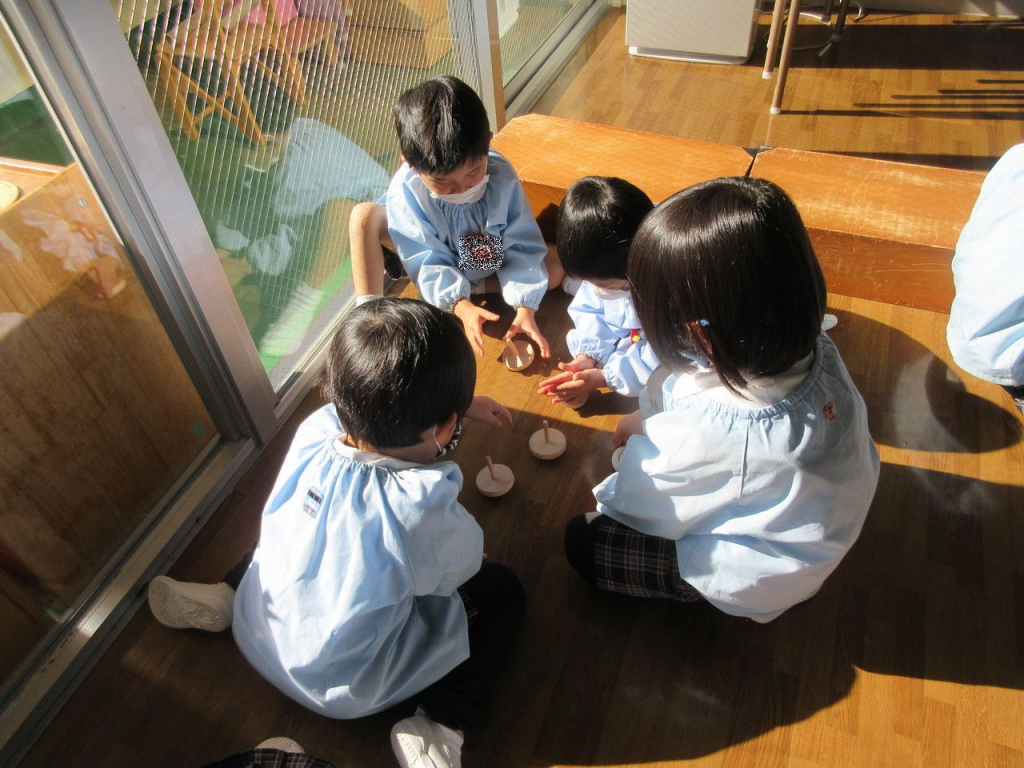 つぼみ組では、こま・お手玉・けん玉・だるま落とし・カルタなどの伝承あそびを楽しんでいます♪日本の伝統的なあそびを通して、お友だちと一緒に遊ぶ楽しさを感じられるように取り組んでいます。こまあそびでは最初は個々でじっくりとこまが回る様子を楽し... -