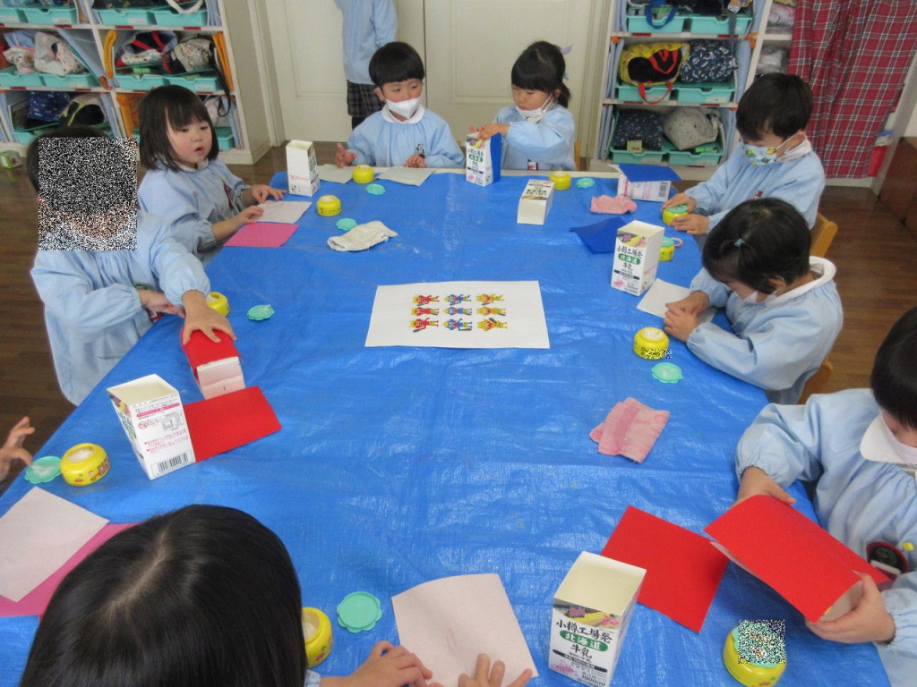 つぼみ組では、節分の由来や意味を知り、豆まきの行事を楽しむことができるように、鬼の製作をしました!牛乳パックの土台に自分の作りたい鬼の色の折り紙を貼り、布やボタン、モールなどの素材を使って鬼の顔やパンツを作りました✨「鬼に金棒を持たせたい... -