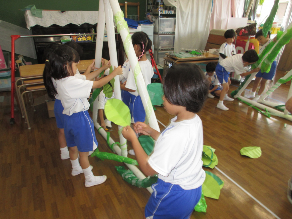 年長では、運動会のダンスで着る衣装を子どもたちと一緒に作ることになりました✨ジャックと豆の木の蔓をイメージして、Tシャツに手ぬぐいの編み込みと手形スタンプを押しています🤲手形スタンプは、年長全員で手を取り合って、力を合わせられるよう心を込... -