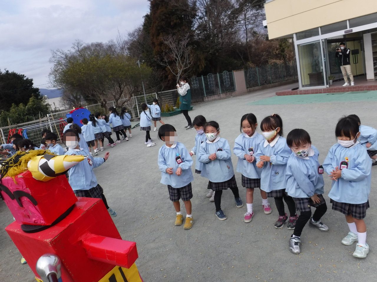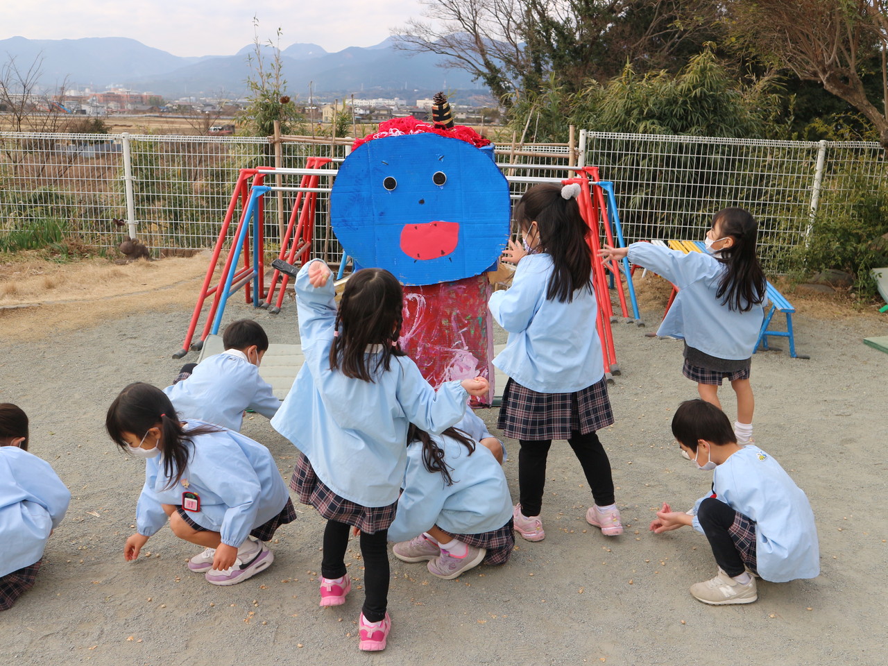 2月3日の節分では自分たちで作った鬼に向かって、「鬼は外!」「福は内!」の掛け声と共に豆を投げました。