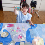 的当てでは、銃や剣を作っていましたが、輪ゴムや風船を使ってボールを遠くまで飛ばせる様になり、怖い魔物をイメージした的作りやその家・洞窟を作り出しています👻