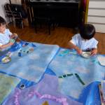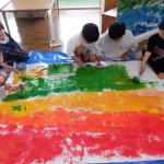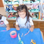 車作りでは、自分用の走らせる小さな車を作っていましたが、みんなが乗れるバスにしよう!と大きな窓のあるお友だちと一緒に乗れる虹色のバス作りをしています🚌