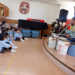 バケツや廃材などの身近な物でドラムセットを組み立て、水道管に使われる塩ビパイプを“ディジュリドゥ”という笛のように吹いて音を奏でるバケツドラマーのMASAさんを保護者の会のみなさんが園に呼んで下さり、年少・中、年長の順番で演奏を聴きました🎶