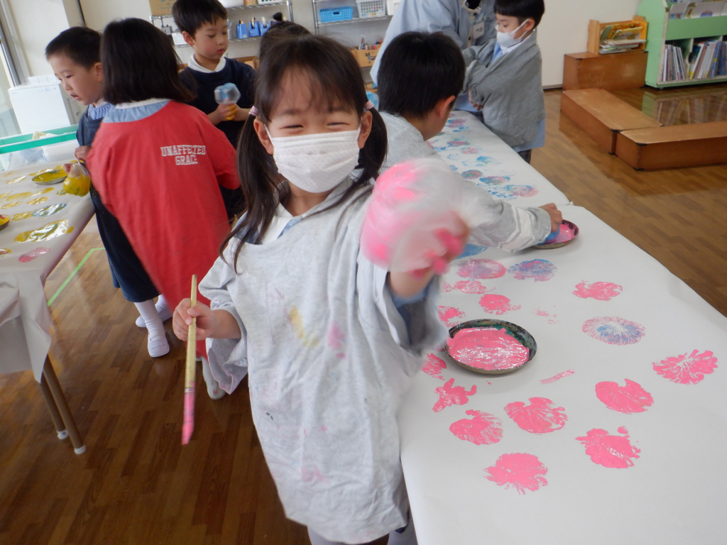大きな模造紙に絵の具とビニール袋、筆を使ってダイナミックに絵の具スタンプをしました😊🎵初めての技法に釘付けの子どもたち✨夢中になって黄色やピンク、赤、水色の絵の具を使っていました😲!絵の具の混ざりあう様子を見て「見て!色が混ざったよ✨」、「凄... -