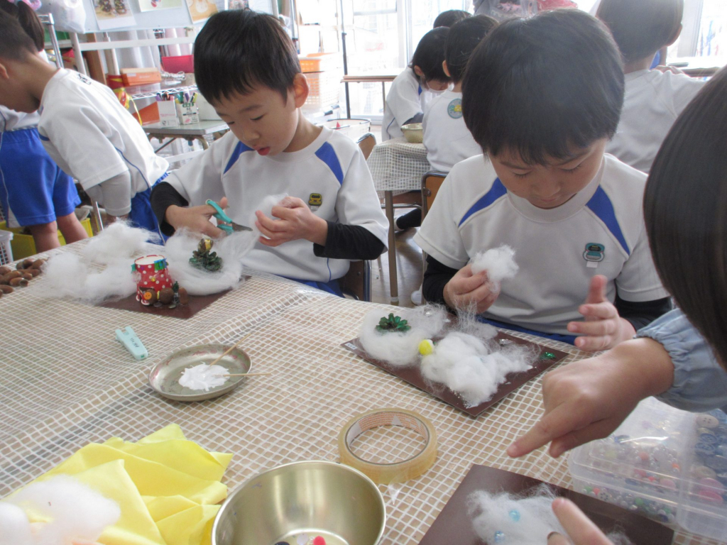 年長組では、秋のアトリエ製作に続き、松ぼっくりや廃材を組み合わせて冬をイメージしたものを製作しています!✨「こうしたらいいかな!」「これはどうかな?」と悩みながらも創り上げる楽しさを味わい、完成した時には、「見てみて!ここは雪っぽくしたい... -