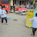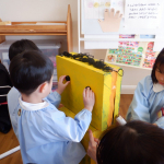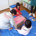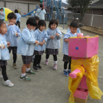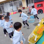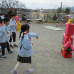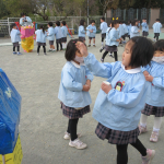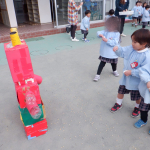 豆まきでは、貰った豆を大事に抱えながら、自分達の作った鬼に向かって「鬼は外、福は内!」と大きな声を出し、鬼に向かって友だちと一緒にたくさんの豆をまき、自分の中にあるいろいろな鬼を追い出しているようでした✨