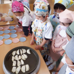 具材ができあがり、皮で包むのは少し難しかったようで、「どうやるの?」「きれちゃいそう。」と、一つの餃子を慎重に包む姿や、「お家でも作ってるよ。」「見て-!」と上手にひだを作る姿など、楽しみながらみんなで作ることができました