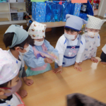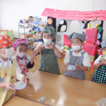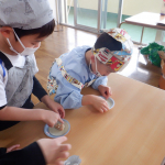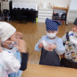 エプロン・三角巾・マスクの準備も、「後ろやってあげる。」「こうやってやるんだよ。」と、子ども達同士で教え合い支度する姿がありました