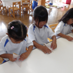 今まで、折り紙をちぎったり、貼ったり…という活動は行っていましたが、折る活動は初めての子どもたち。