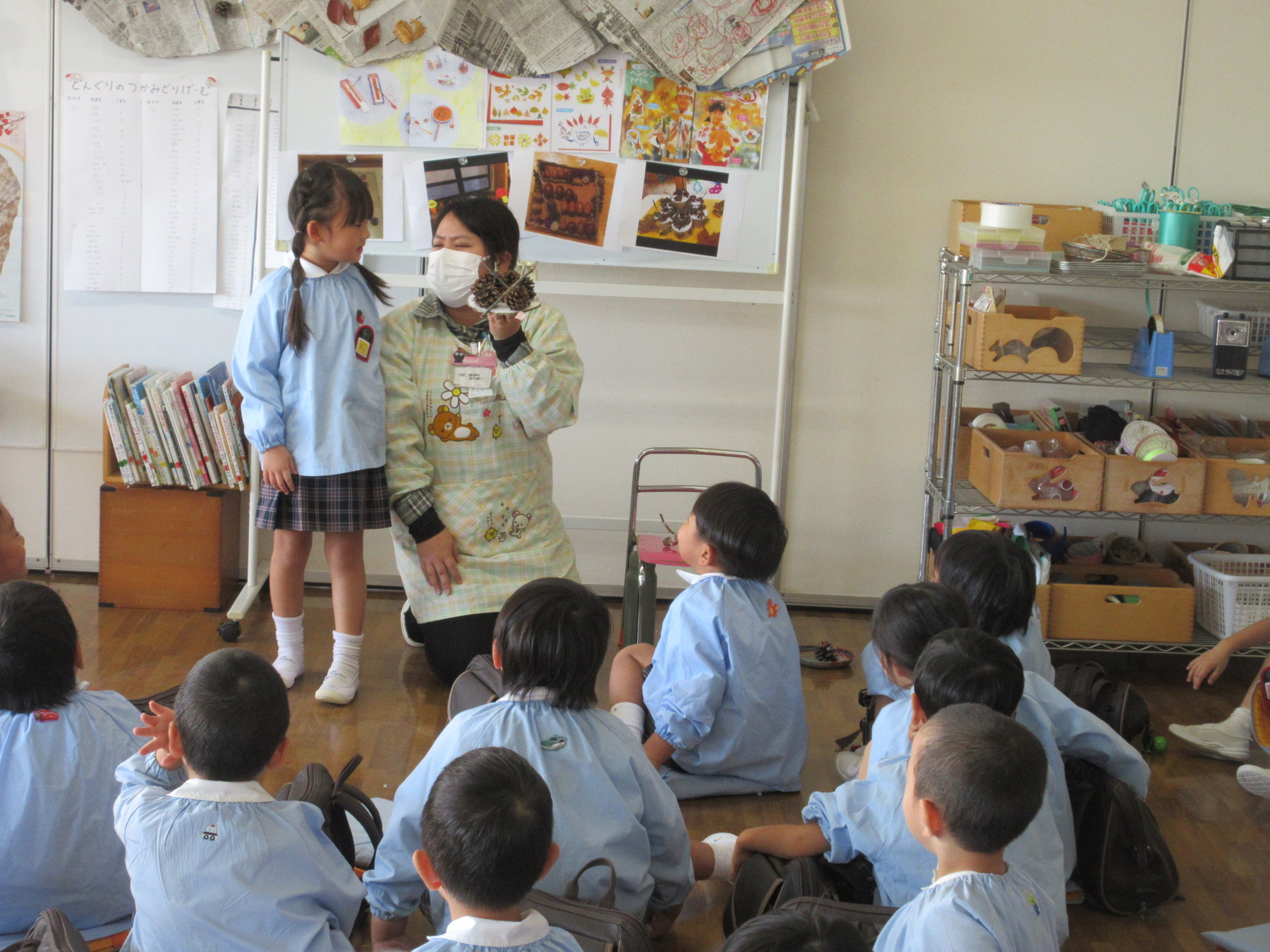 幼稚園では、自分たちの拾ったものを使って製作を楽しんでいます。「どんぐりに顔を書いてお人形を作ったよ👀」、「新聞紙と落ち葉で作ったお洋服👗」と自分が作ったものをお友だちに紹介することで、「私も同じのを作りたいな」と一緒に作り始める姿が見られています🍂