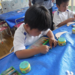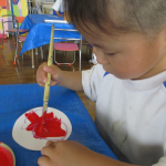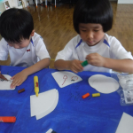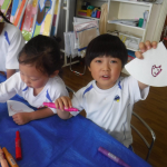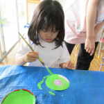 製作では、”にじみ絵”と”はじき絵”の技法を使って、傘とかたつむりを作りました🎵
