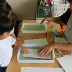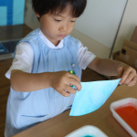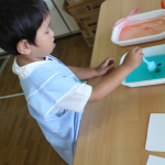 子どもたちは恐る恐るスプーンでインクを混ぜ合わせ、上から優しく紙を置き、その紙をあげてみると…「えー!なにこれ!すごーい!」「魔法を使ってるみたいだね!」とさまざまな反応を見せてくれました