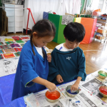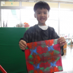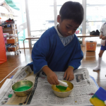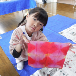 1学期に経験した『染め紙』の技法を用いて、製作に取り組んだ子どもたち。「覚えてるよ!障子紙使うんだよね!」と思い出しながらお話を聞く姿が見られました!