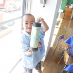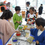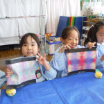 実際にやってみると、「絵の具が染み込んでいく!」「いろんな色を使って虹色にしちゃお!」とカラフルに彩られていくのを楽しながら取り組んでいました!折りたたんである障子紙を開くと、真っ白だった障子紙が1人ひとり違った色や模様に大変身💖「きれいにできた!」「みんな違うね!」など嬉しさを共有したり、「切れないようにそっと置こうね!」と大切に扱ったりする子どたちの姿や、中には光に照らして「見て!光に当てるともっときれいだよ!」と発見を楽しむ子どもの姿も✨