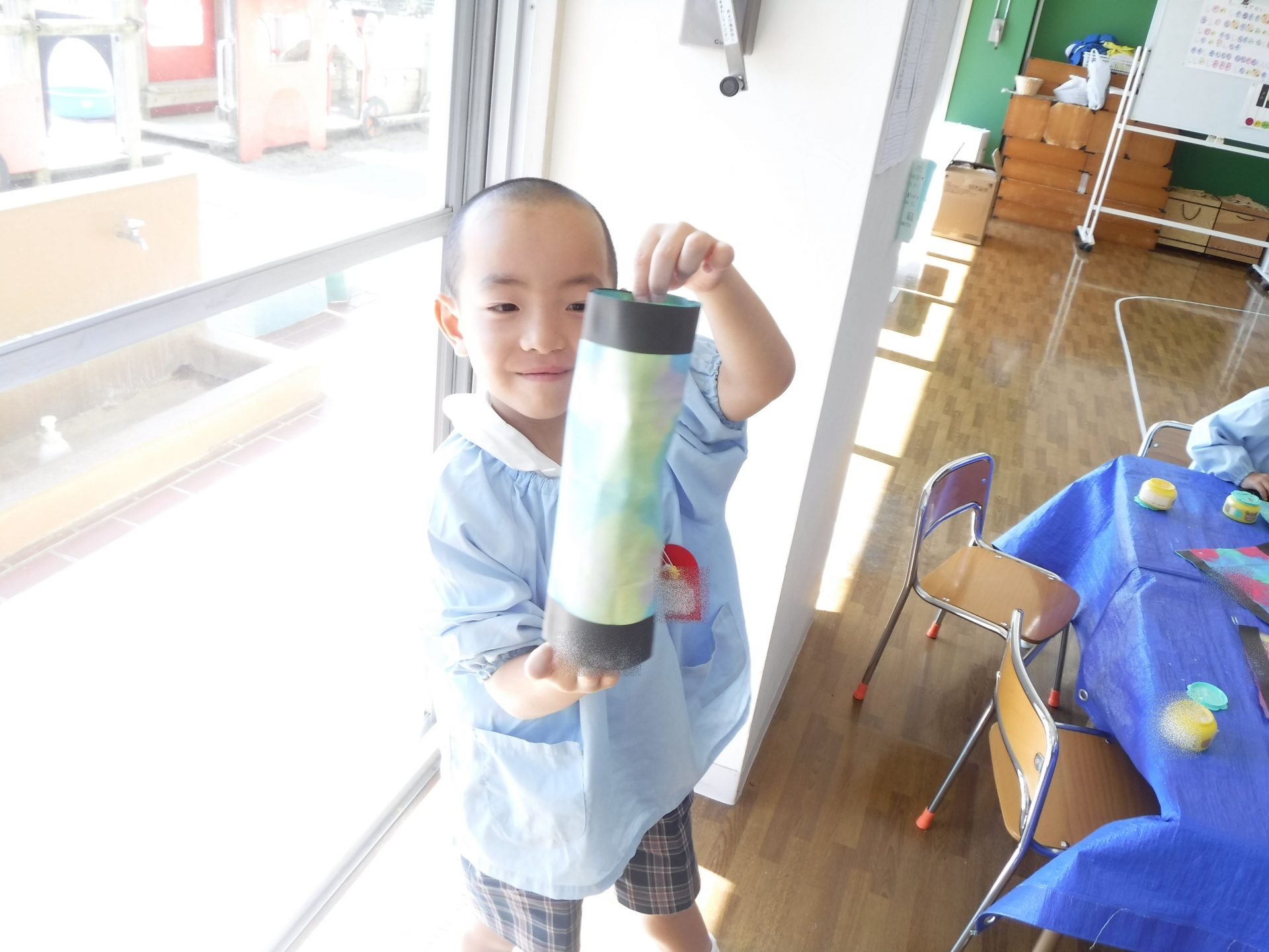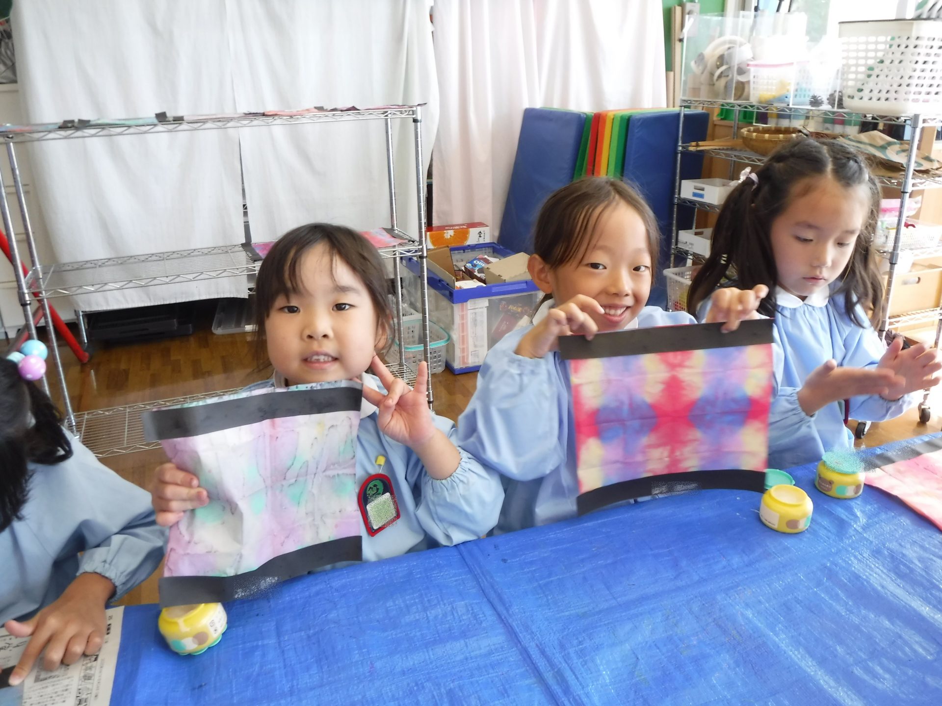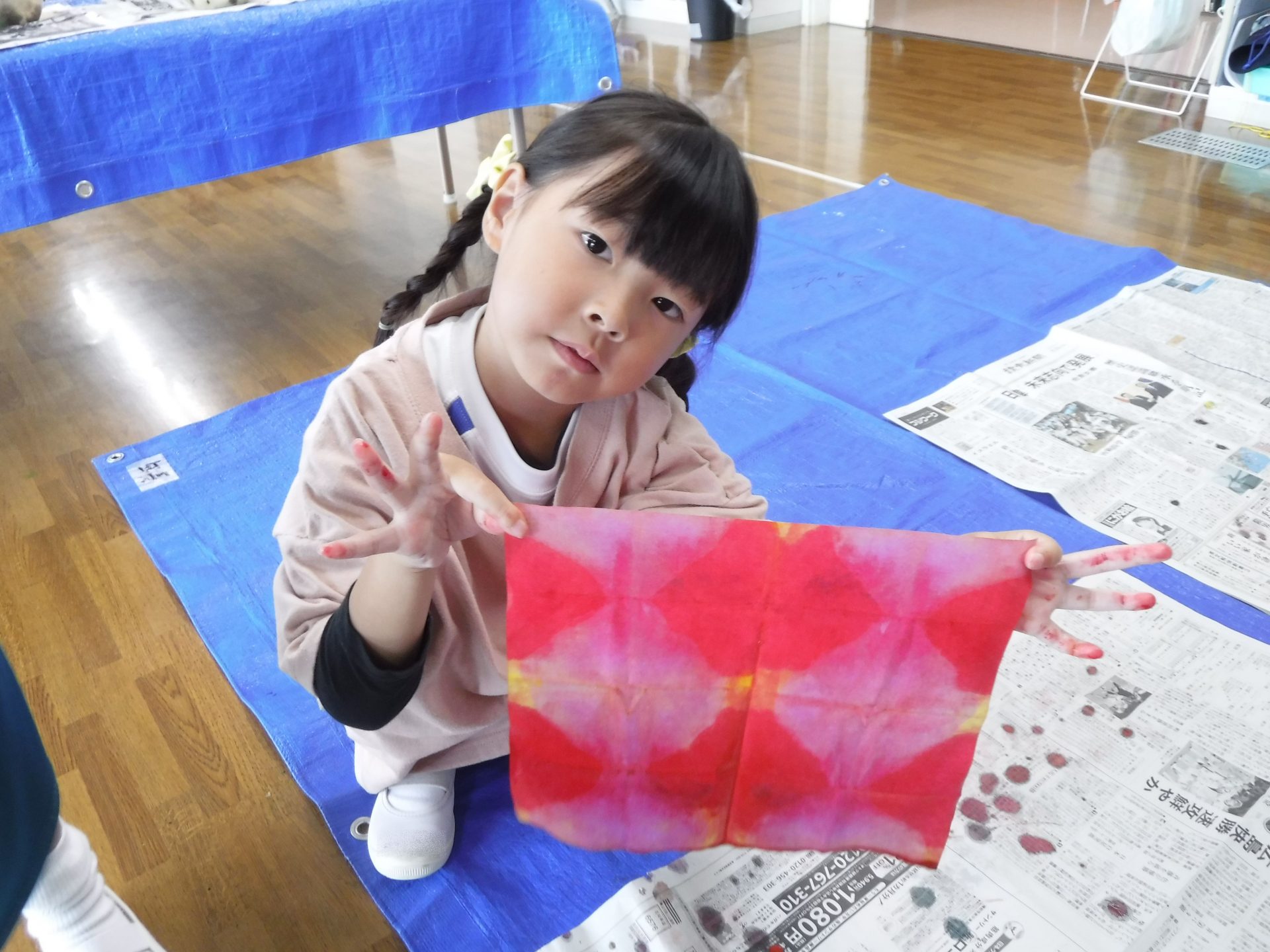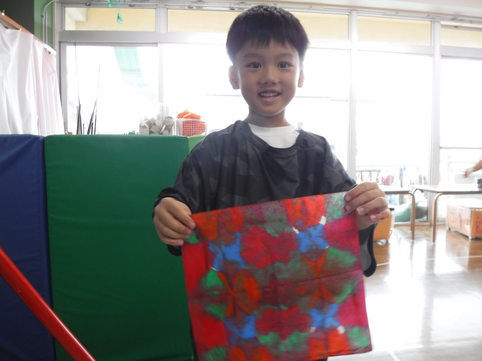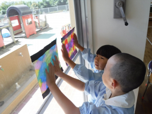 実際にやってみると、「絵の具が染み込んでいく!」「いろんな色を使って虹色にしちゃお!」とカラフルに彩られていくのを楽しながら取り組んでいました!折りたたんである障子紙を開くと、真っ白だった障子紙が1人ひとり違った色や模様に大変身💖「きれいにできた!」「みんな違うね!」など嬉しさを共有したり、「切れないようにそっと置こうね!」と大切に扱ったりする子どたちの姿や、中には光に照らして「見て!光に当てるともっときれいだよ!」と発見を楽しむ子どもの姿も✨