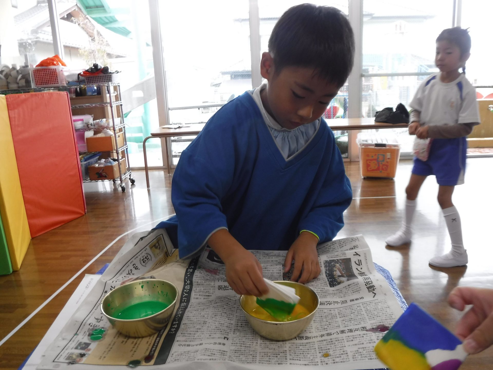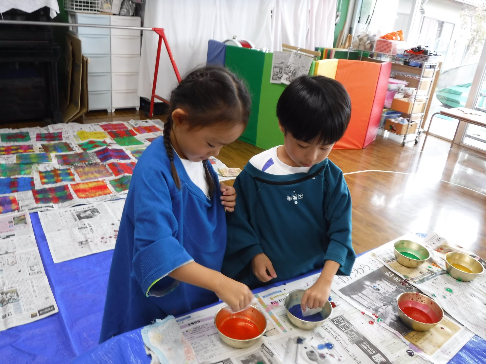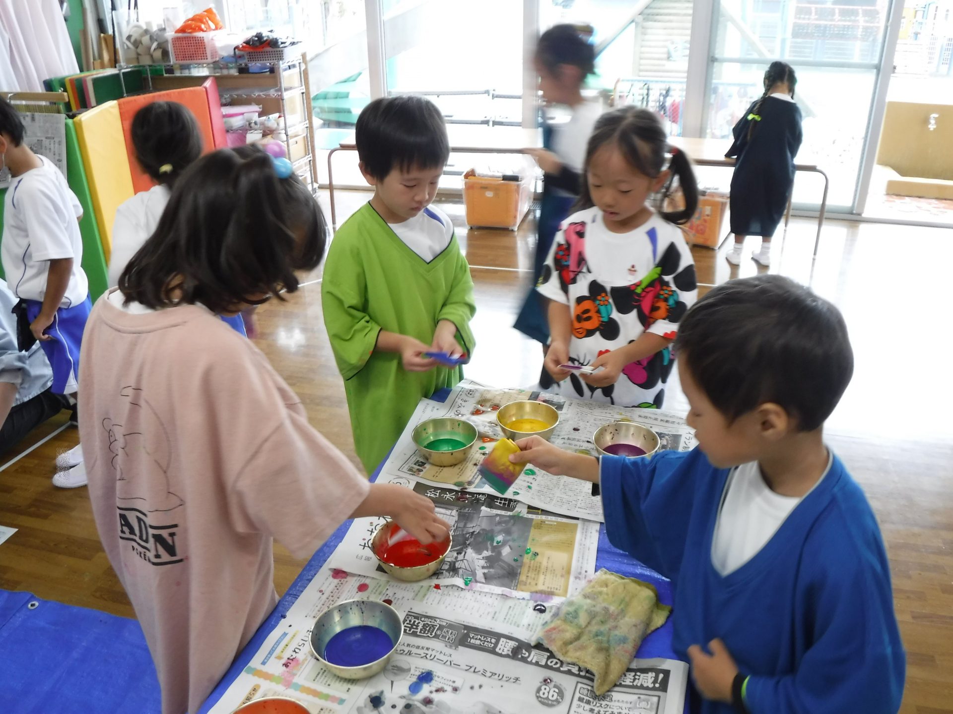 1学期に経験した『染め紙』の技法を用いて、製作に取り組んだ子どもたち。「覚えてるよ!障子紙使うんだよね!」と思い出しながらお話を聞く姿が見られました!