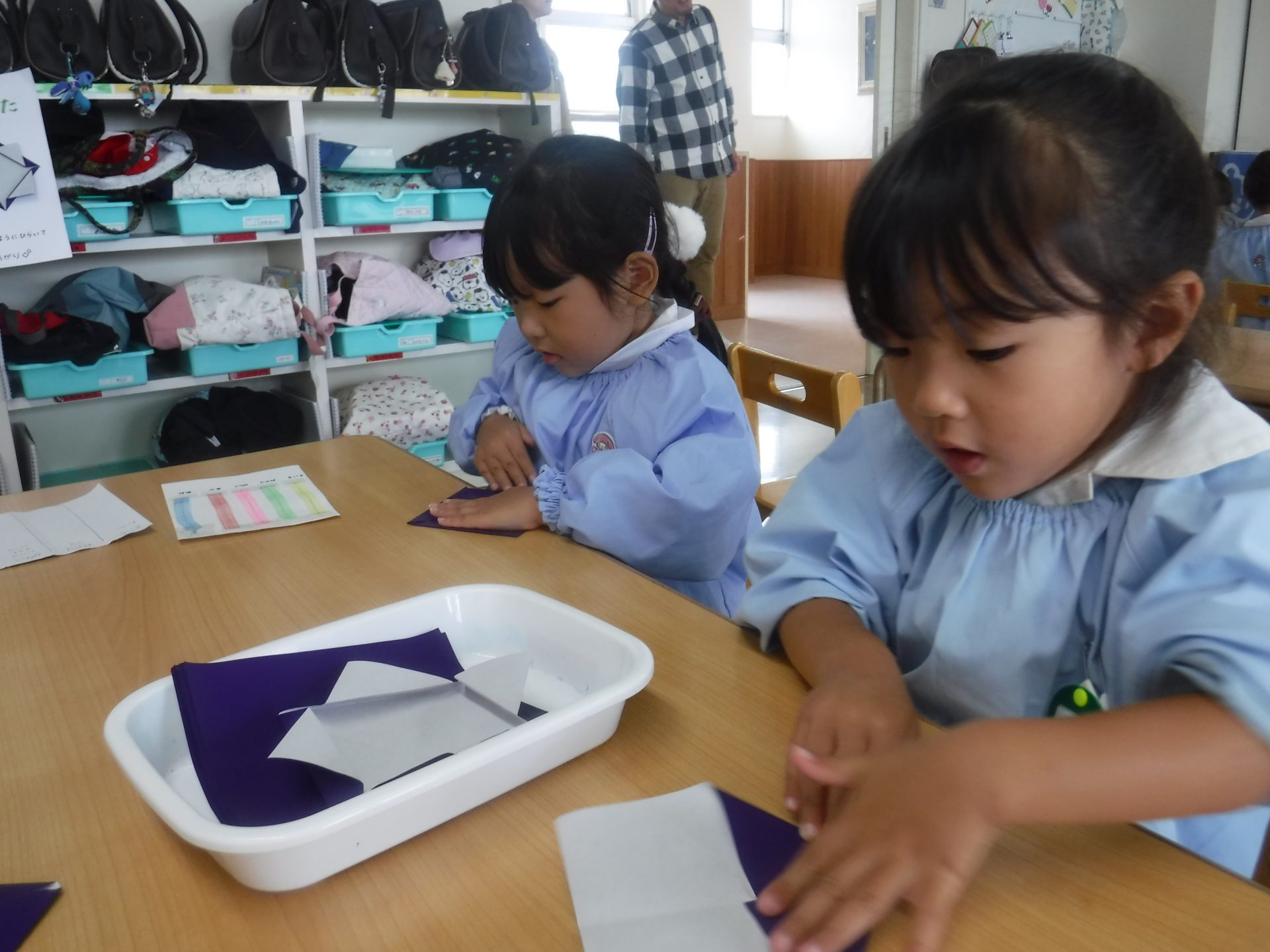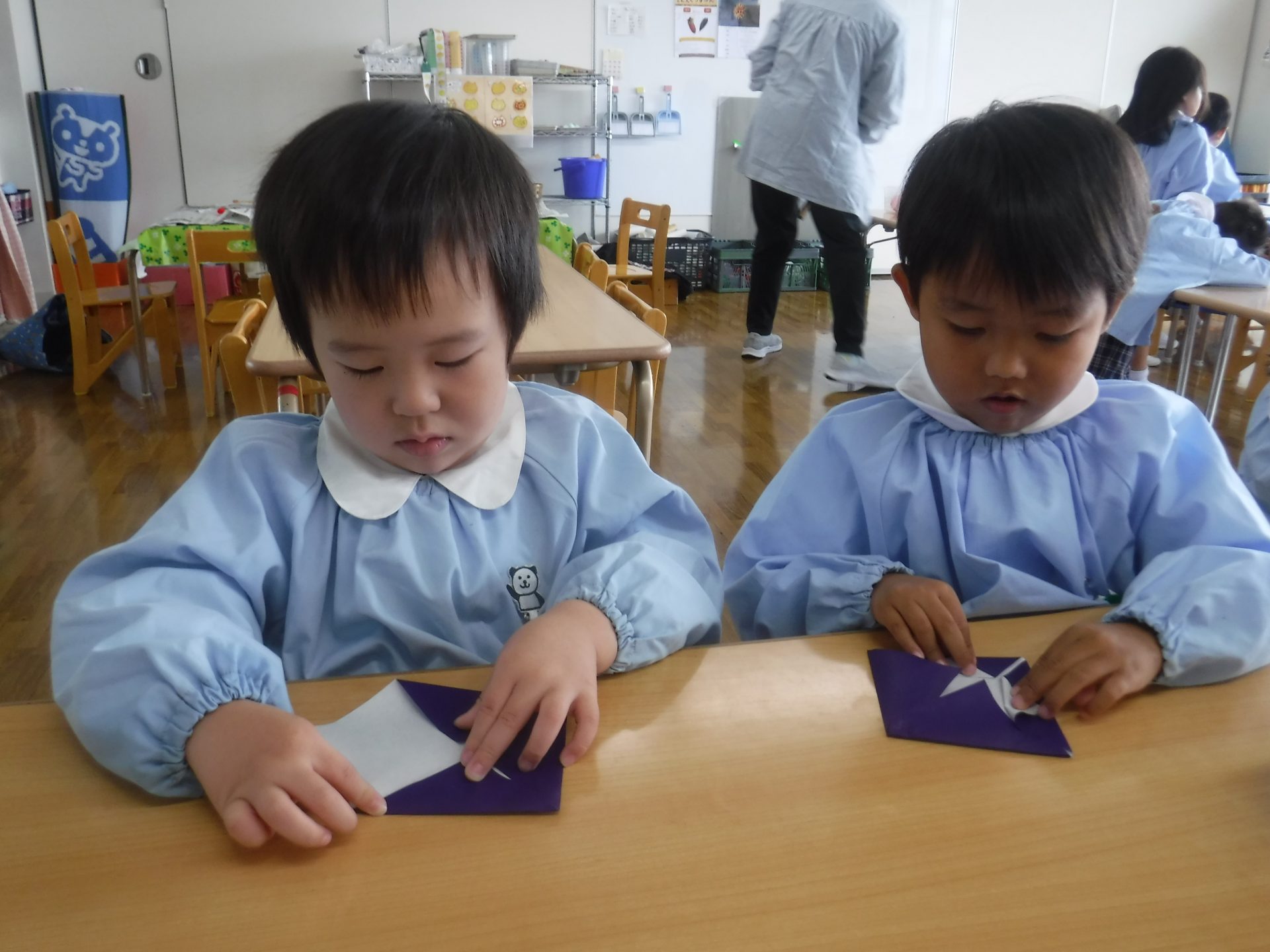 初めは、ピッタリと紙を重ねることに難しさも感じていましたが、折り方が分かると嬉しそうに「折ったらアイロンかけるんだよね~