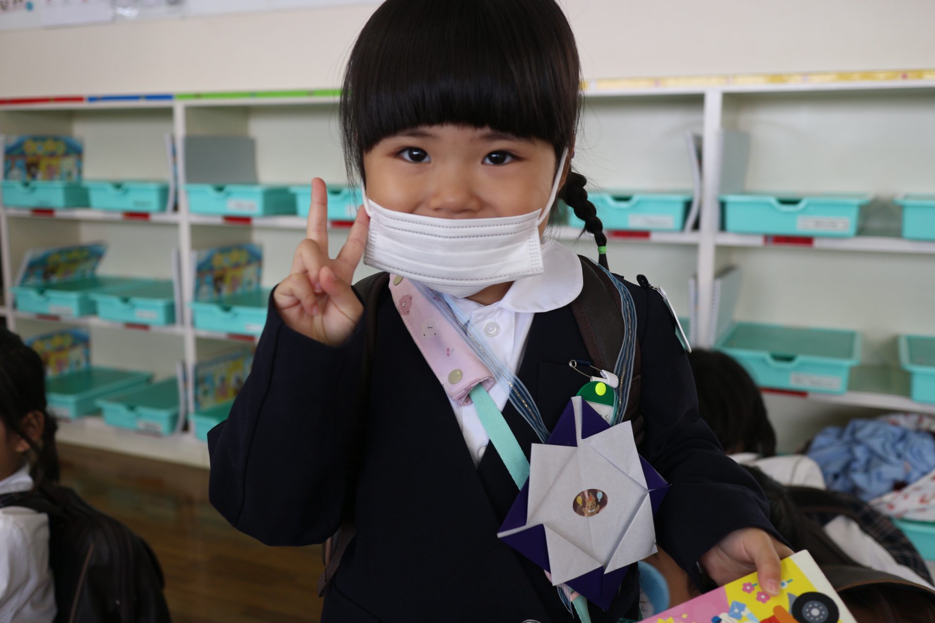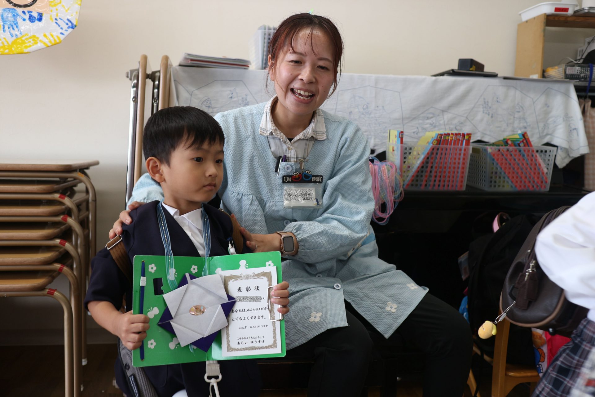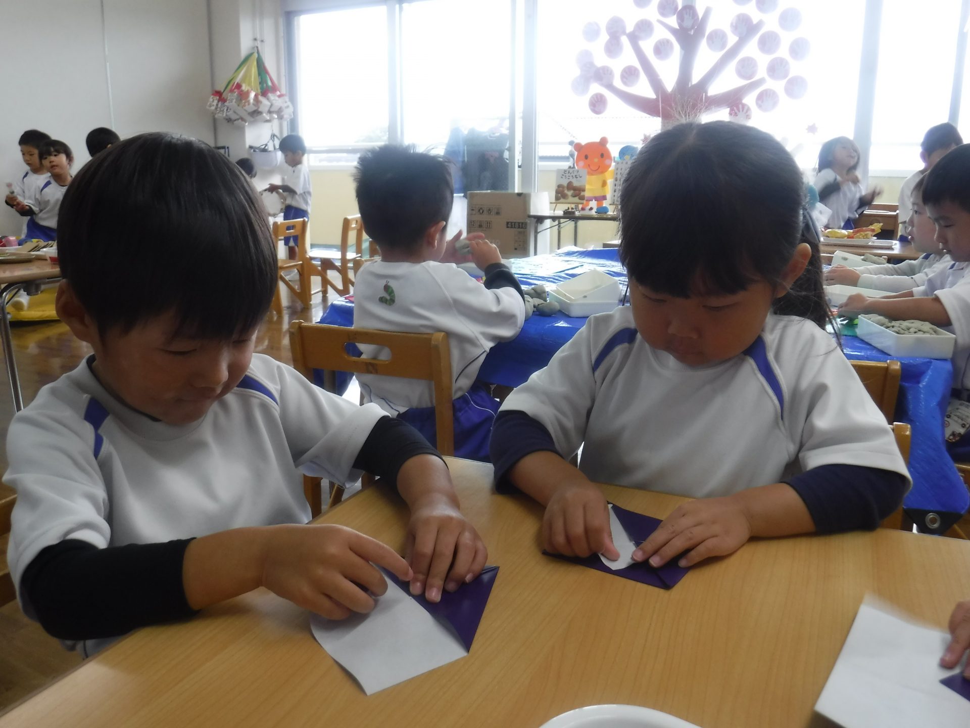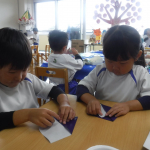 折り紙あそびが楽しかったようで、「もっとやりたい!」「今度は壁面にある木にどんぐりを折って貼ってみたい