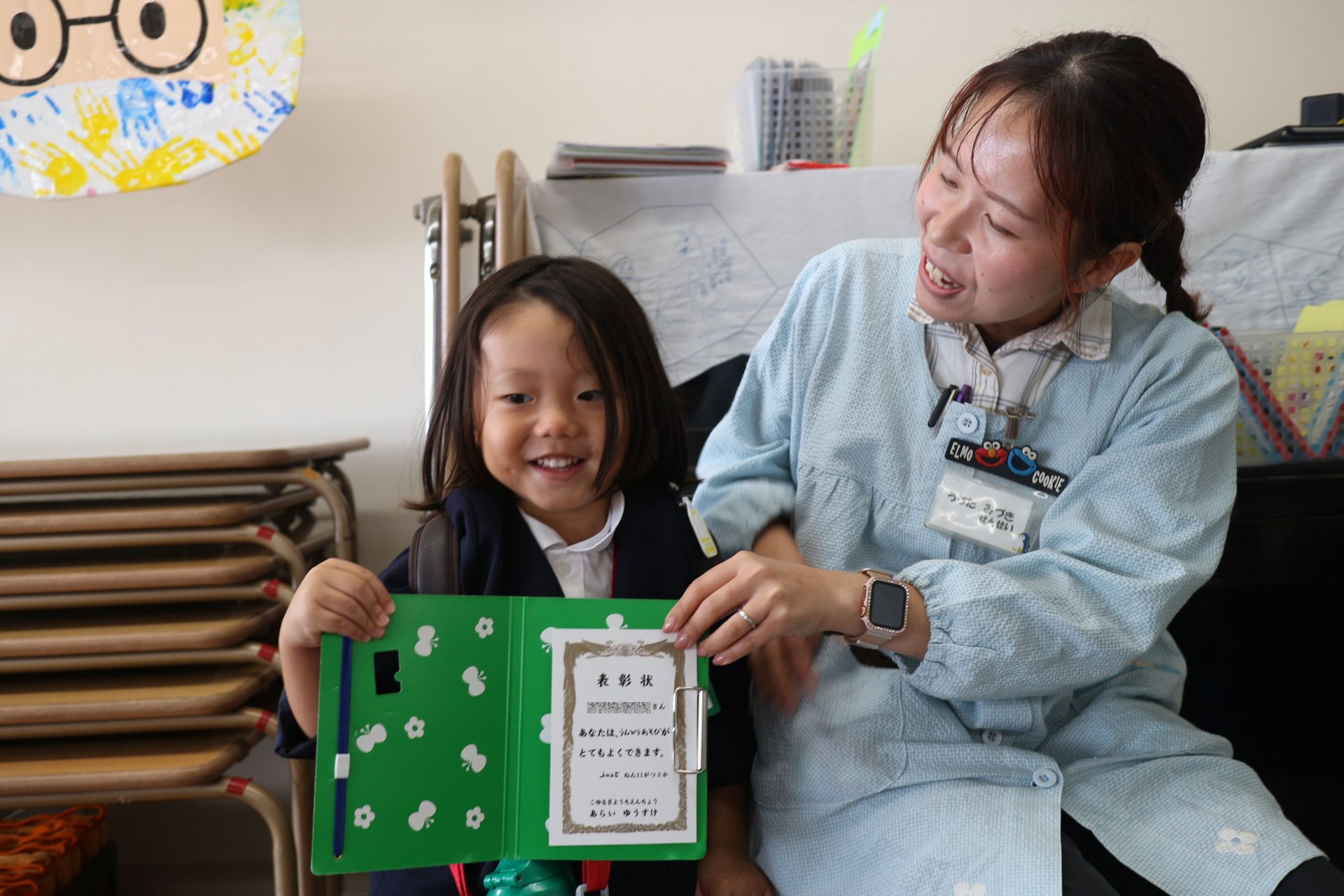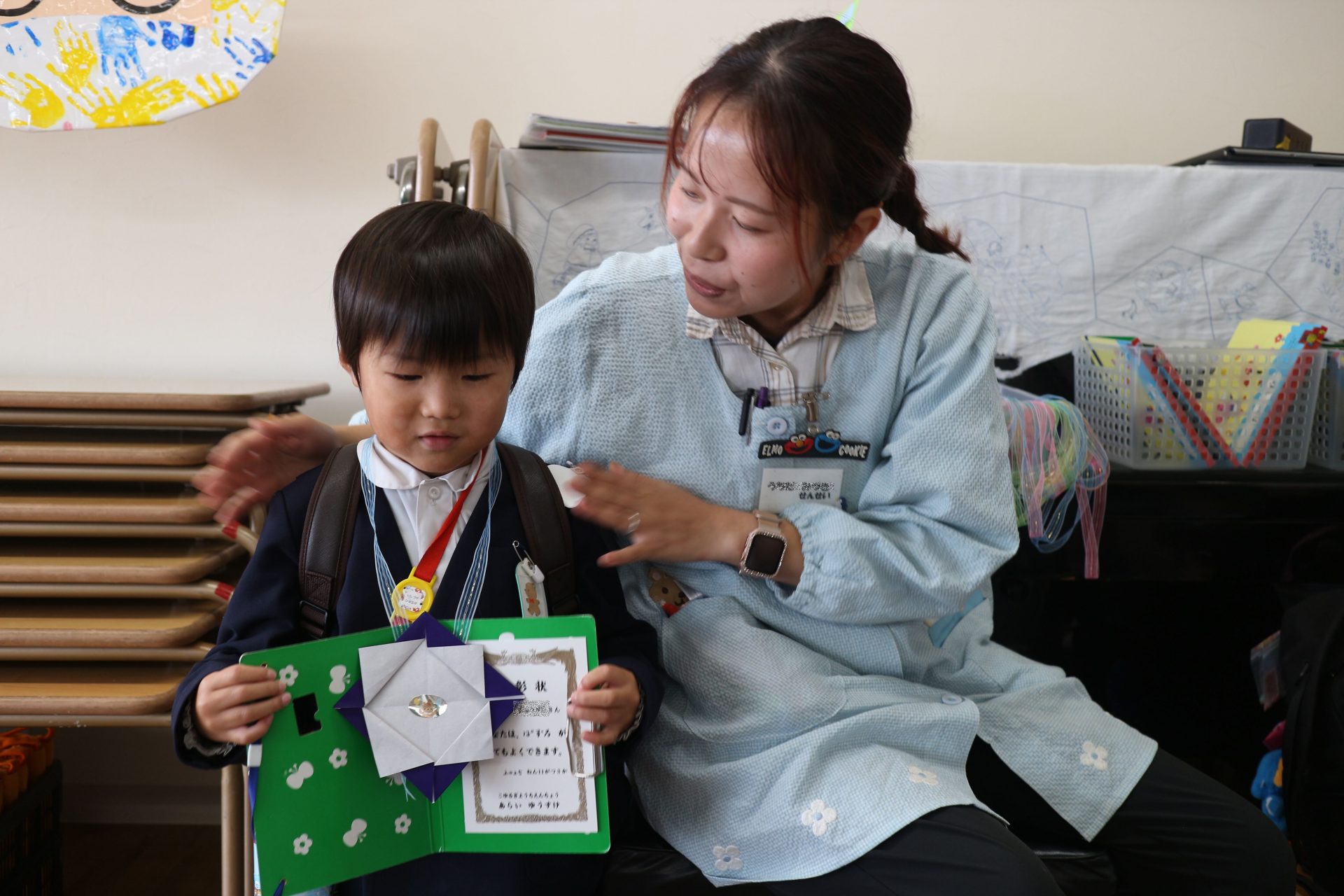つぼみ組では、初めての折り紙あそびで文化勲章のメダルづくりをしました![]()