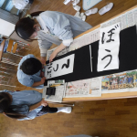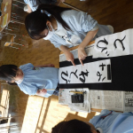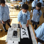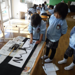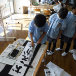 筆や半紙、墨を使って文字を書くことを伝えると、「お兄ちゃんが宿題でやってるところ見たことあるよ!」「昔の人は筆を使って文字を書いてたんだよね!」と知っていることなどを話すなど、書き初めをすることを楽しみにしている様子の子どもたち