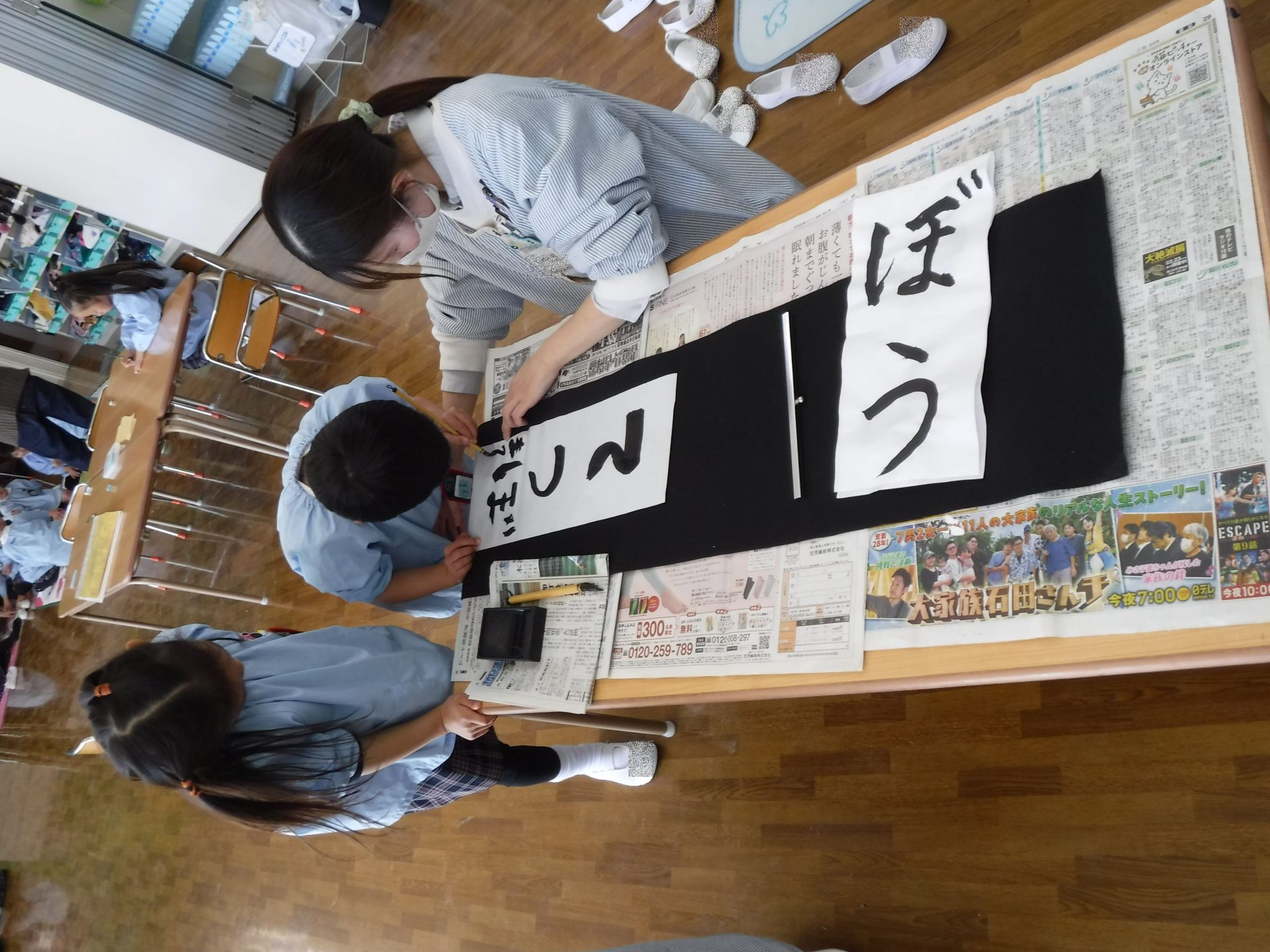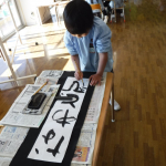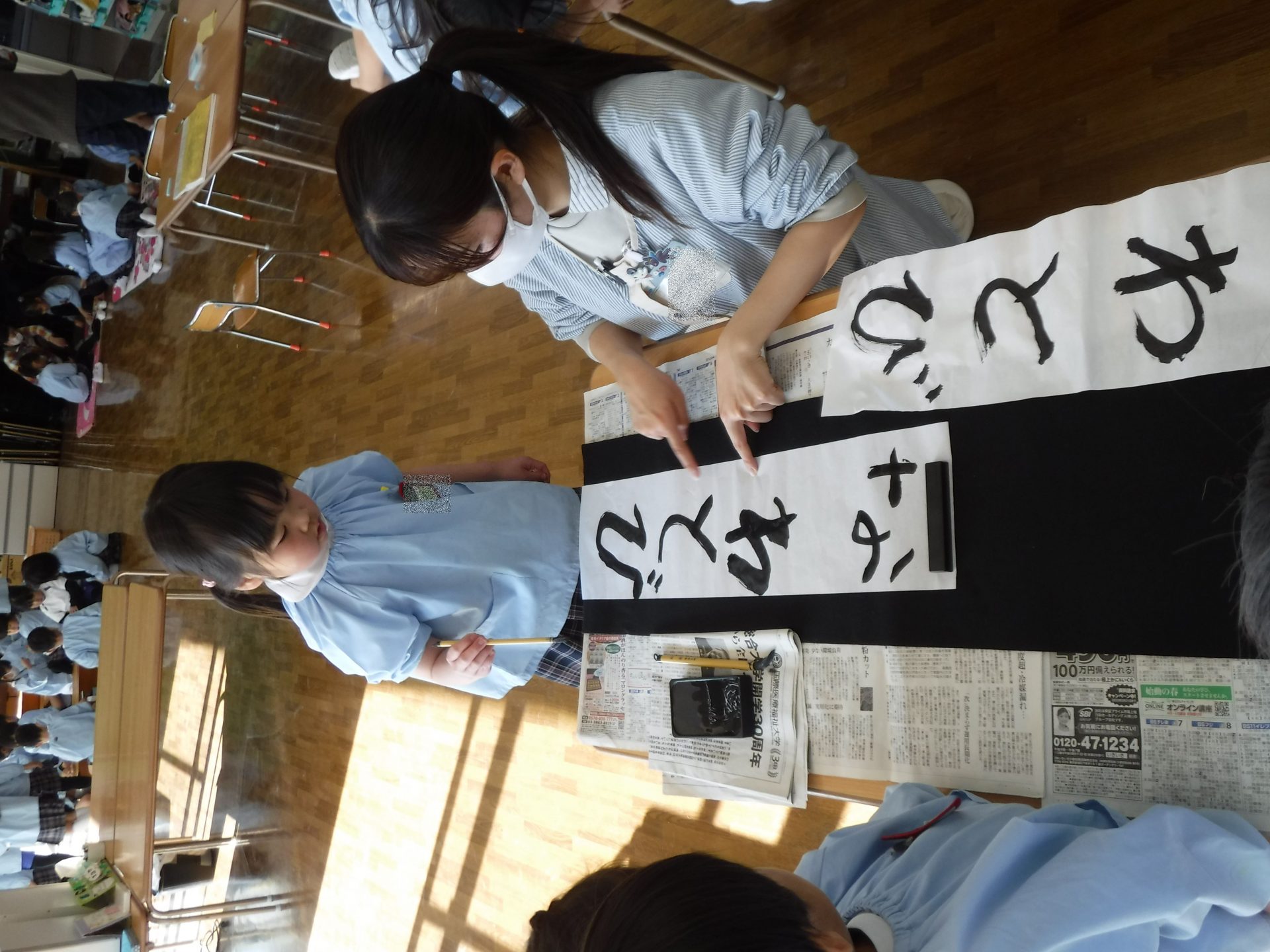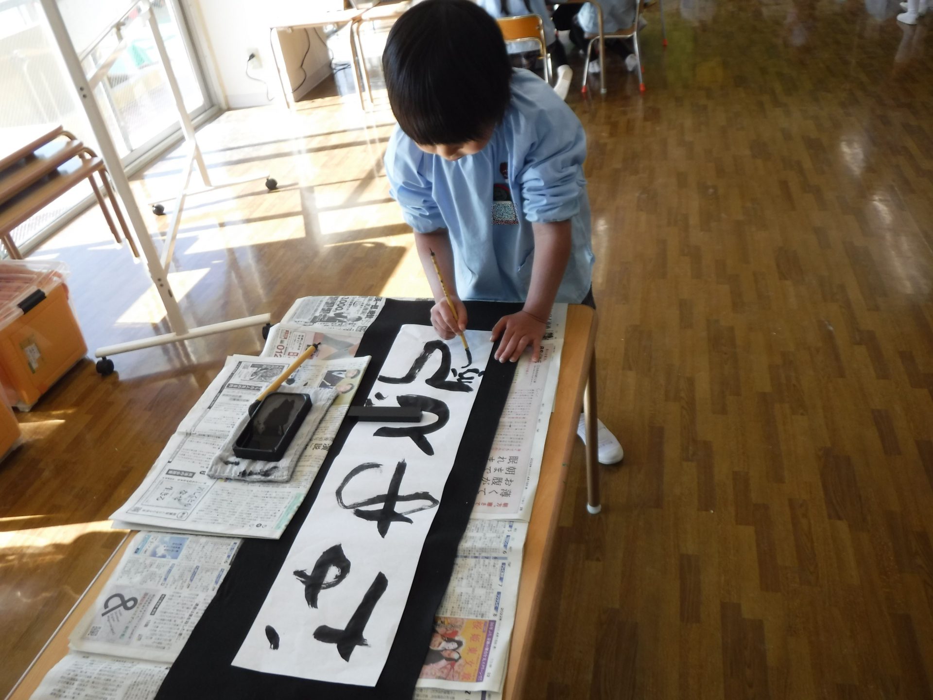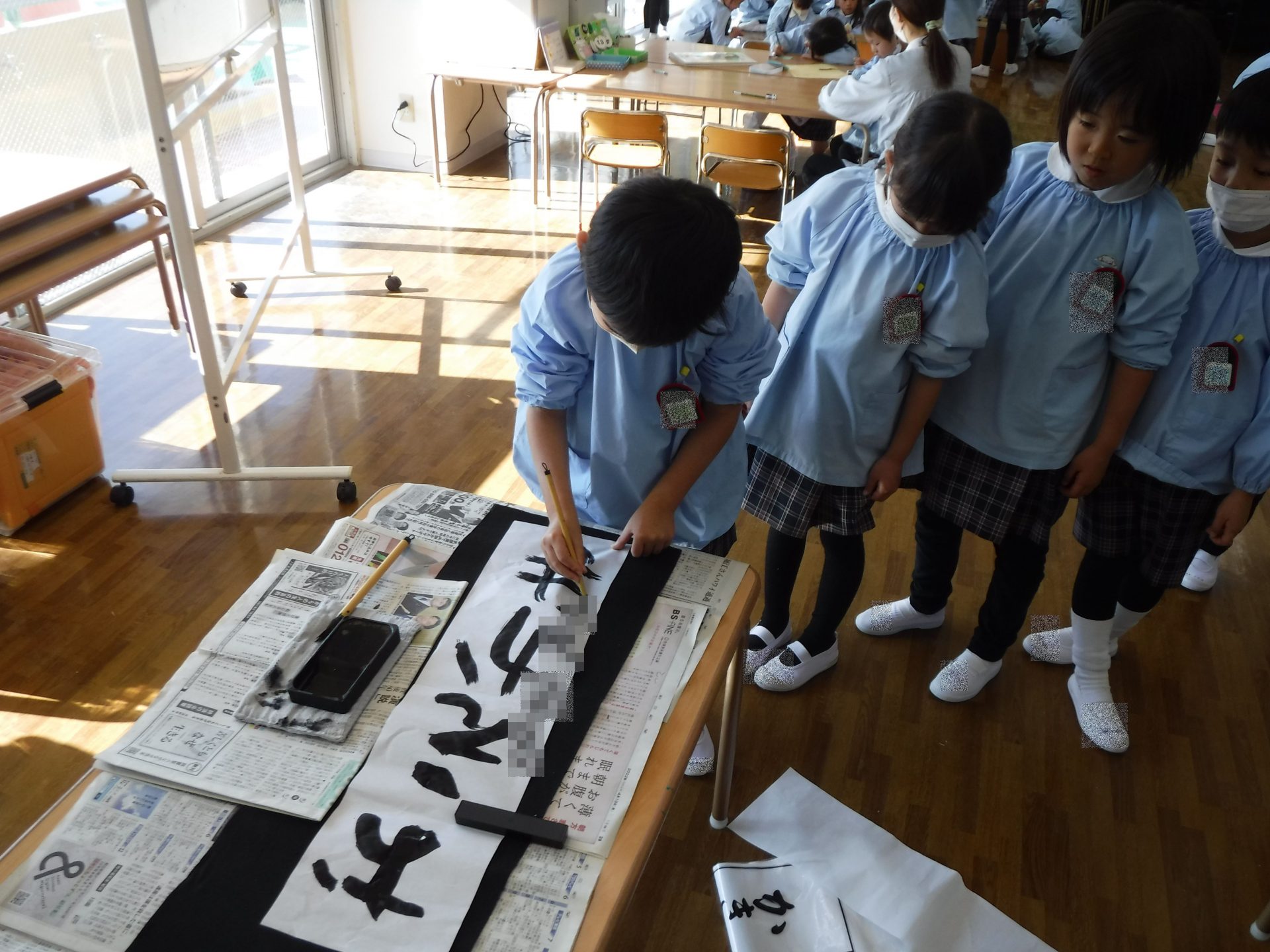 さっそく書き初めに挑戦子どもたちに目標を聞いてみると、「もっとみんなと楽しく過ごしたい!」「鉄棒で空中逆上がりができるようになりたい!」「ひらがなを上手に書けるようになりたい!」などそれぞれ自分なりの目標を持っている姿がありました。筆を使って書いてみると、「筆が柔らかいから、書くのが難しい・・・」「サラサラしてて書くのが面白い!」とはじめての素材に苦戦している様子もありましたが、筆と半紙を使って書くことを楽しむことができました