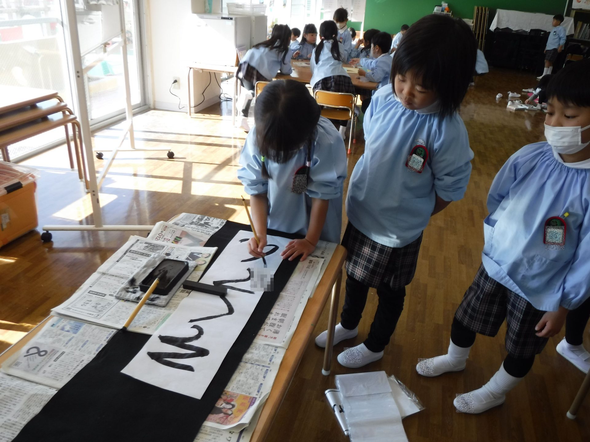 年長組では、3学期頑張りたいこと・小学校までにできるようになりたいことなど目標を持って過ごすことができるように書き初めに取り組んでいます