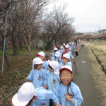 年長組みんなで梅見散歩に行きました!梅が咲いている場所に向かう園バスの車内では、「梅咲いてるかな?」「しだれ梅綺麗なんだよね~!見れるかな!」とワクワクしている様子🎶