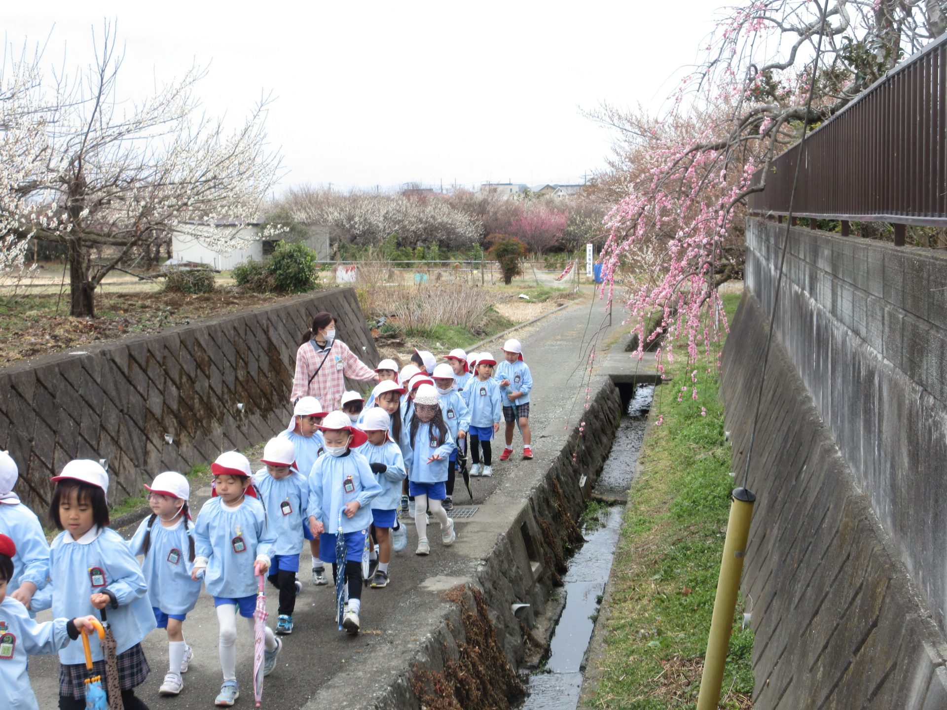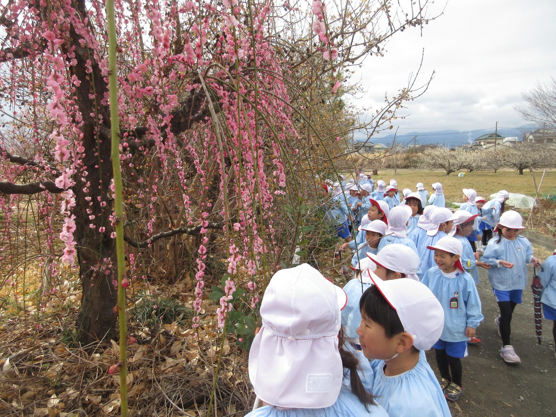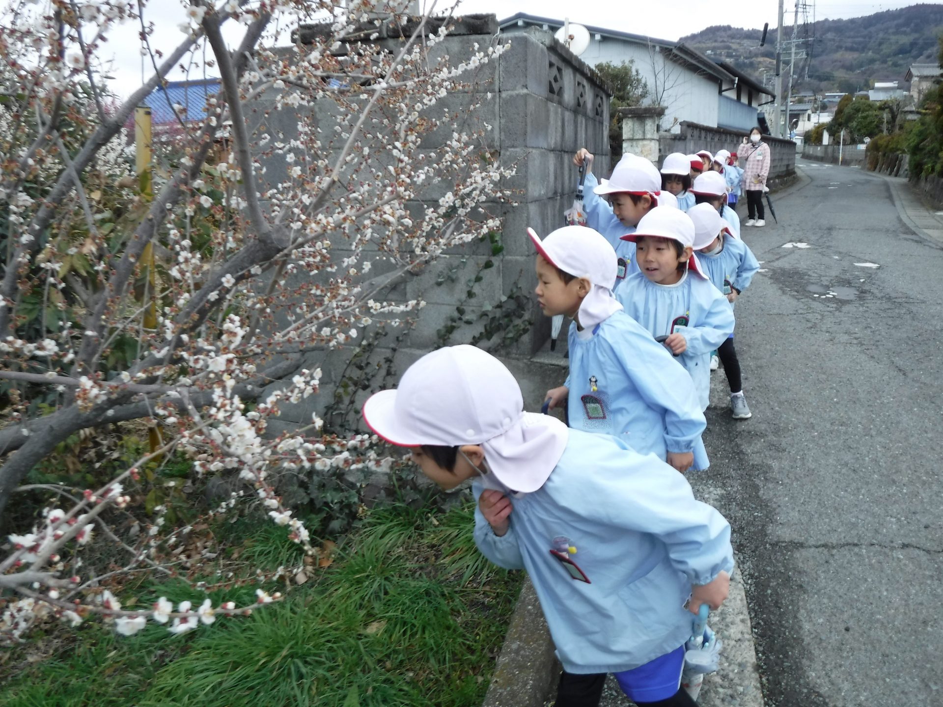 年長組みんなで梅見散歩に行きました!梅が咲いている場所に向かう園バスの車内では、「梅咲いてるかな?」「しだれ梅綺麗なんだよね~!見れるかな!」とワクワクしている様子🎶