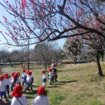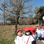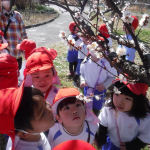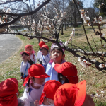行きは園バスに乗り、バスから見える風景に「あ!あそこに梅の花が見えた!」「こっちにも見えるよ‼白い色だね」と色とりどりの梅を見つけることができ、子どもたち心はワクワク感で満開のようです![]()