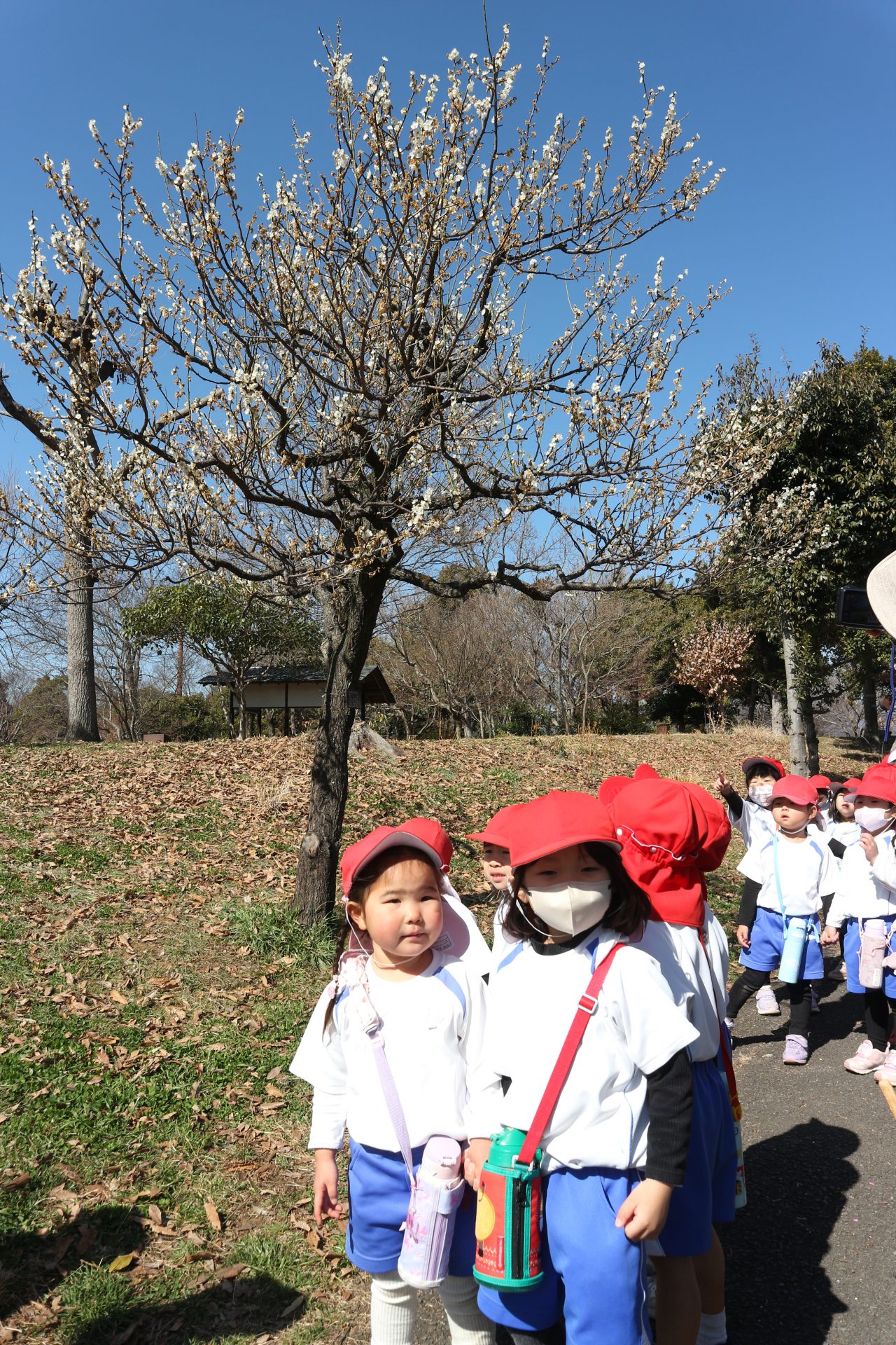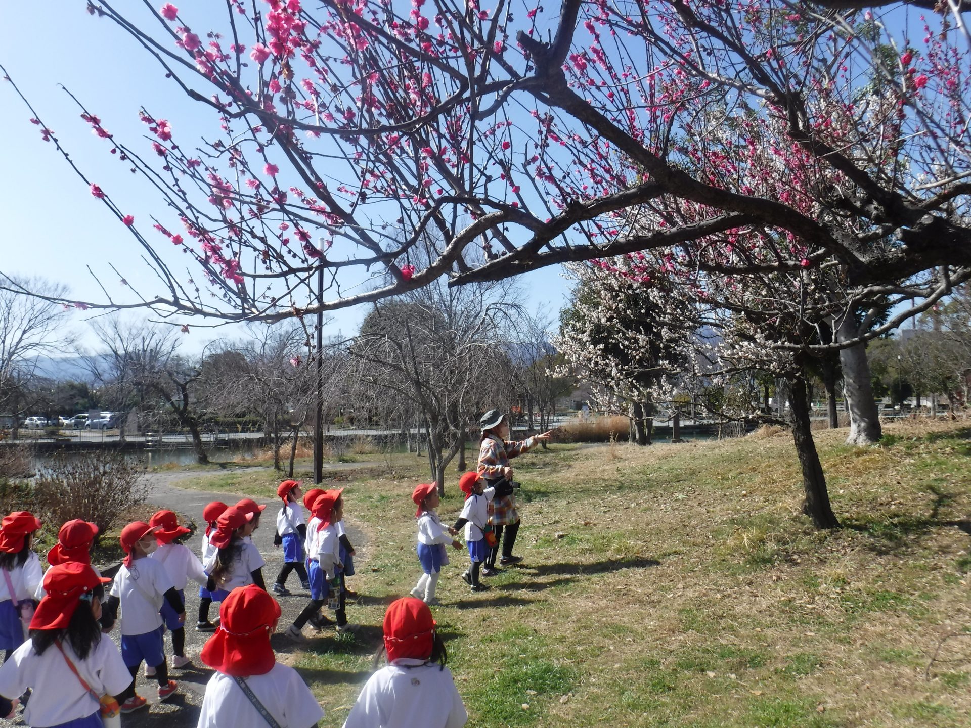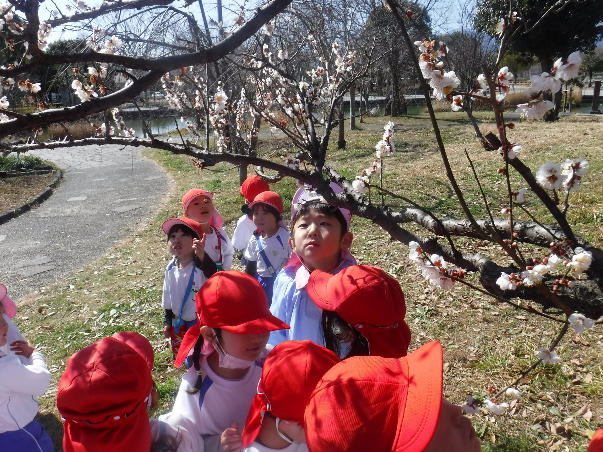 行きは園バスに乗り、バスから見える風景に「あ!あそこに梅の花が見えた!」「こっちにも見えるよ‼白い色だね」と色とりどりの梅を見つけることができ、子どもたち心はワクワク感で満開のようです![]()