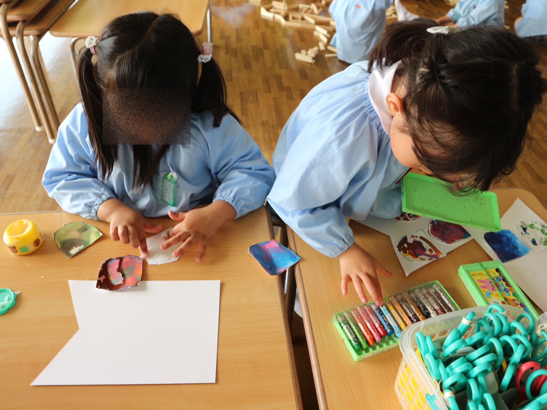 絵の具を使って、ストロー吹き・フィンガーペインティング・にじみ絵の3種類の技法から1つ選び鱗作りがスタート✨