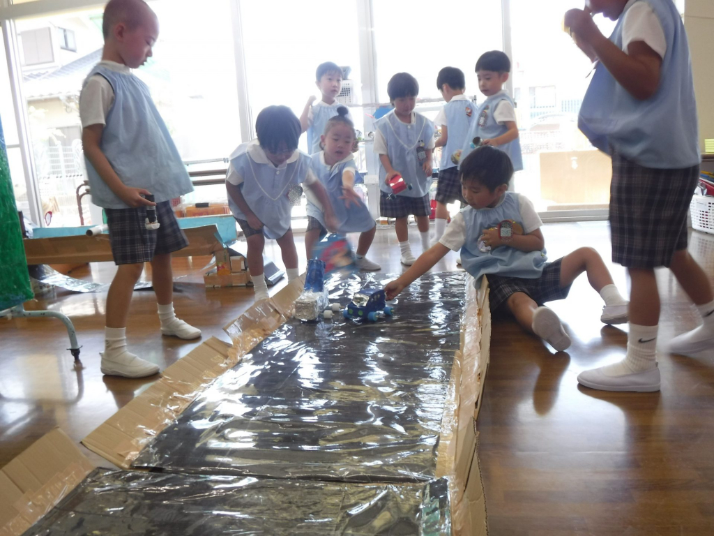 年長組では、アトリエを通しての製作がいくつかの遊びに広がり、子どもたちとたくさん話し合い、試行錯誤しながら遊びを創り進めています。それぞれのあそびに色々な形を使って作ったから「あそびといろいろなかたちらんど」がいい!と、名前も決まり遊ん... -