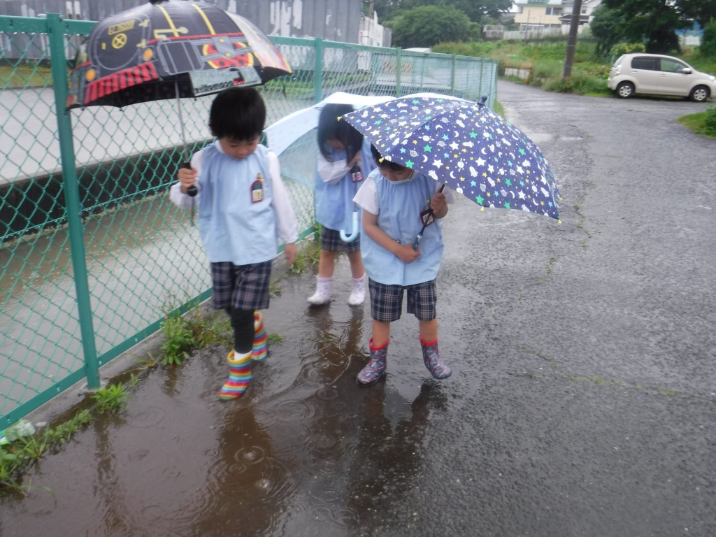 年中組も雨の日散歩に行ってきました☔傘の使い方を確認したり、雨の日ならではの過ごし方を楽しみます!雨の音、雨のにおい、雨粒の感触に触れたり、五感を使いながらお散歩です🎵「雨、最初はサーサーだったけど今はポツポツポツ!って強くなってきた😄」「...