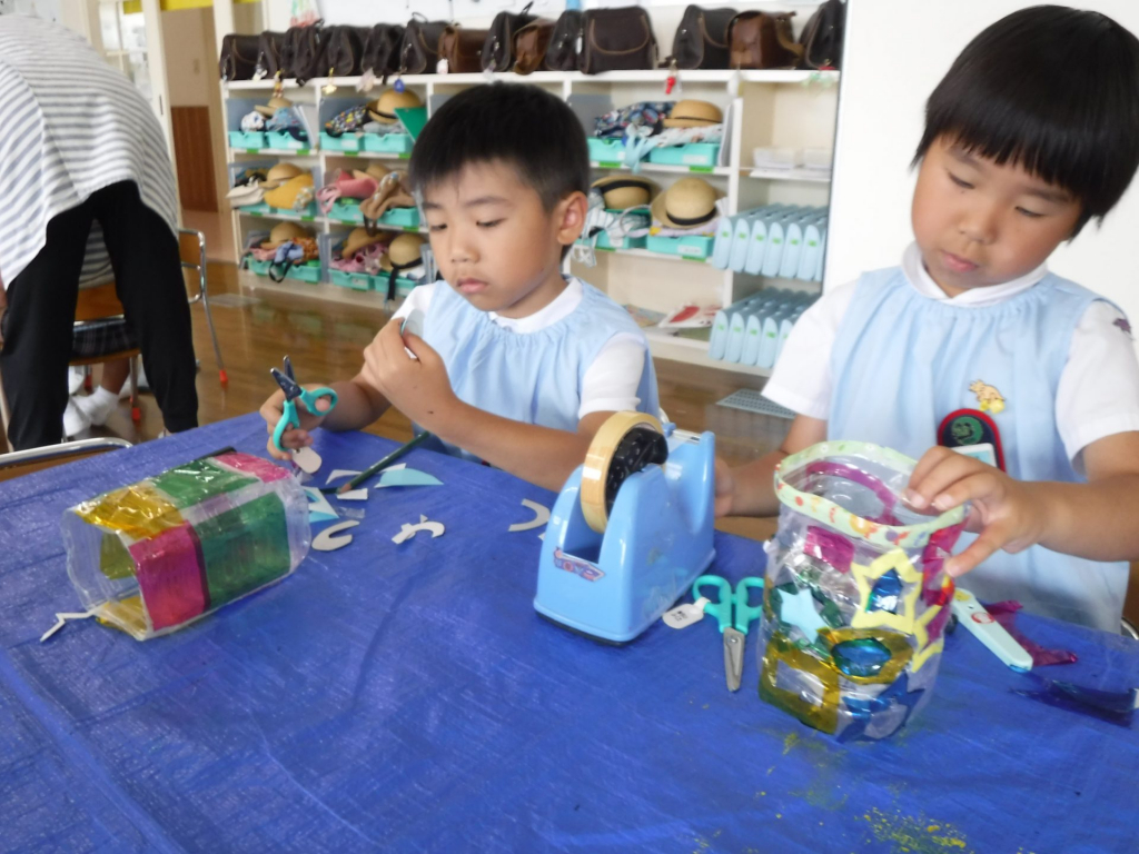 年長組では、来週の火曜日・水曜日にあるお泊り保育をとても楽しみにしていますお泊り保育でどんなことをしたいかを子どもたちと話し合った中で、「夜はキラキラした飾りを作りたい!」という声があり、ランタンを作ってみることにペットボトルの土台にカ... -