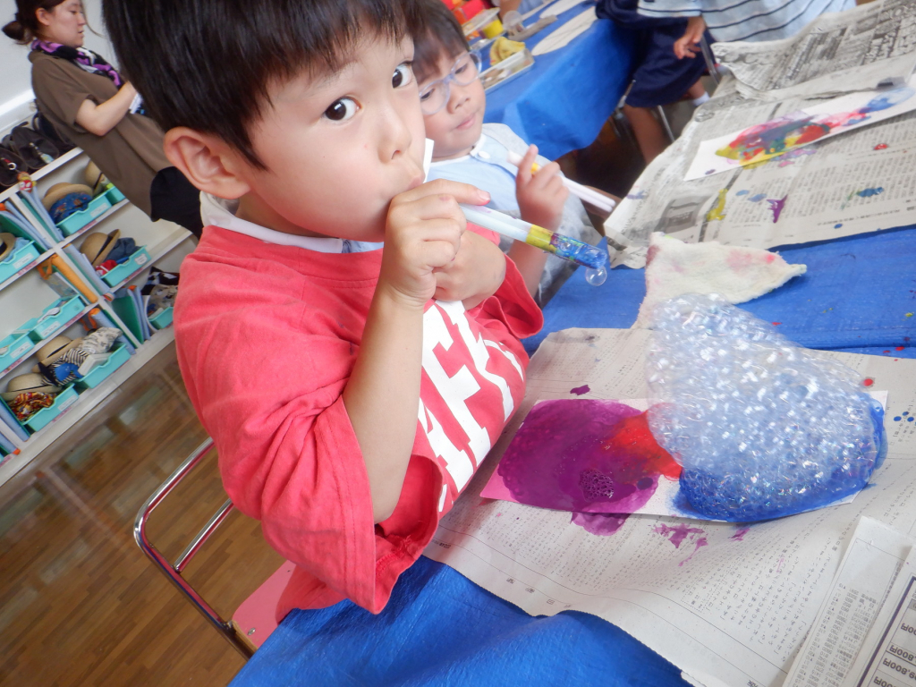 年中組では、七夕の製作としてバブルアートの技法に触れながら短冊製作に取り組みました🎋「シャボン玉に色がついてるよ♪」「どんな風になるんだろう😲」と興味津々の子どもたち💗好きな色のシャボン玉液を選び、ストローで「ふ~!!」と息を吹き込むと、、、...